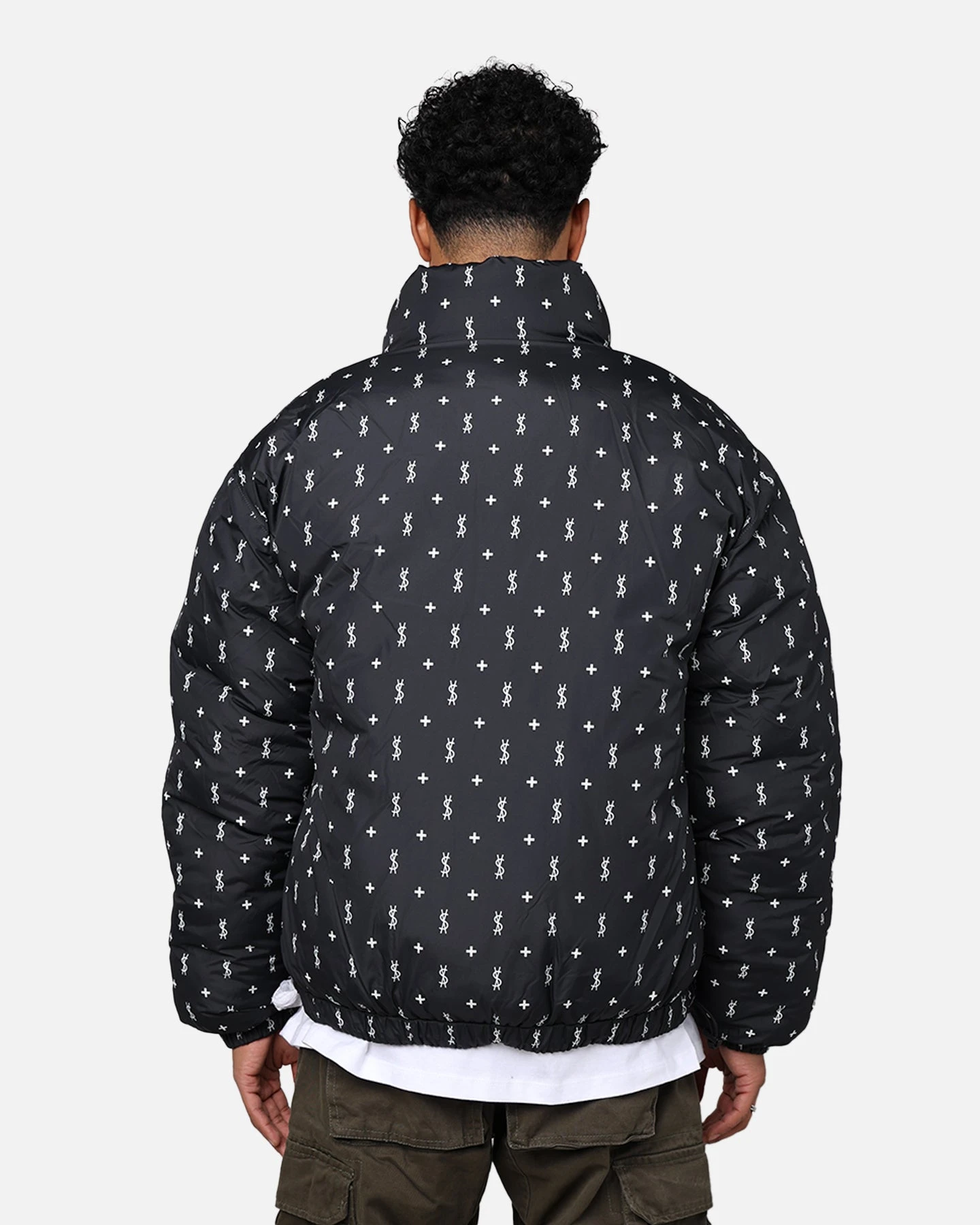 The Flight Puffer Jacket features a funnel collar, internal and external welt pockets, side seam Ksubi branded toggles and a front zip closure. This is a reversible puffer jacket: the external side features a diamond pillowed repeat pattern with a cross embroidery, the internal side features the Ksubi dollagram repeat printed pattern. Finished with the signature woven sleeve tag, and signature T-box and 4×4 branding and Ksubi branded hardware.