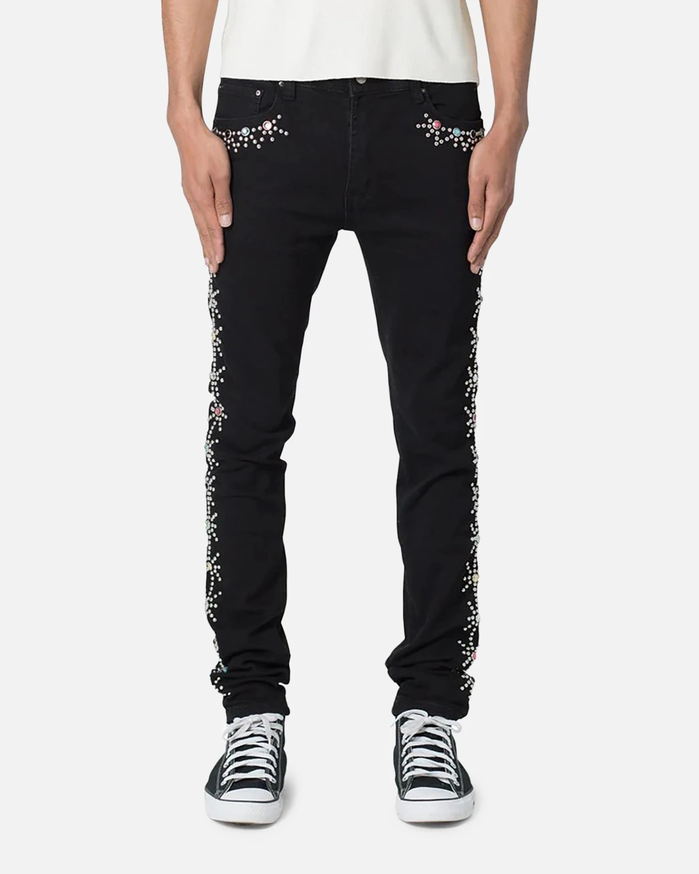Elevate your jean game with the X620 Studded Skinny Denim by MNML. These are designed to have a skinny fit throughout with an extended inseam for stacking, and features a light rinse wash and finished with studding details on the outseam and around the pockets. Cop yours today at Culture Kings.